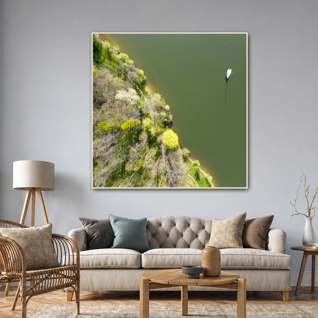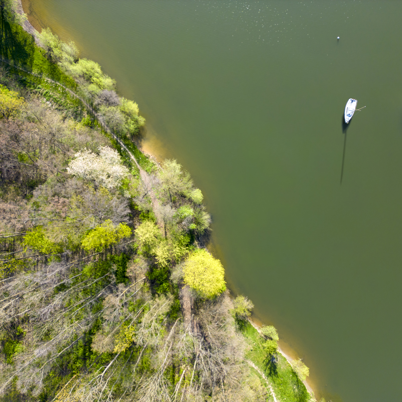 Letecký pohled na jarní ráno u Těrlické přehrady s jemnými zelenými odstíny probouzející se přírody a klidnou hladinou s loďkou u yacht klubu.